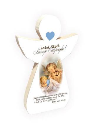 Drewniana figurka aniołek z napisem "Anioł stróż Naszego chłopczyka."